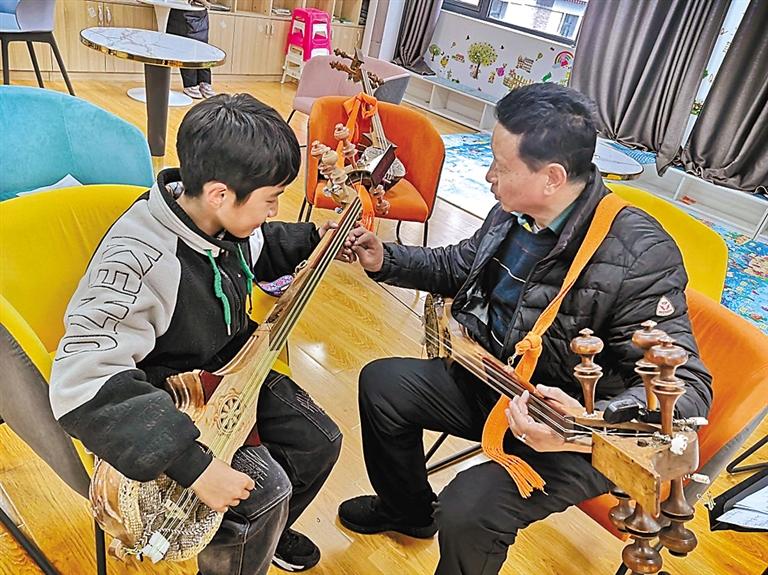 圖為興趣班老師在教學(xué)員彈扎念琴。記者 謝筱純 王珊 通訊員 德吉 攝
