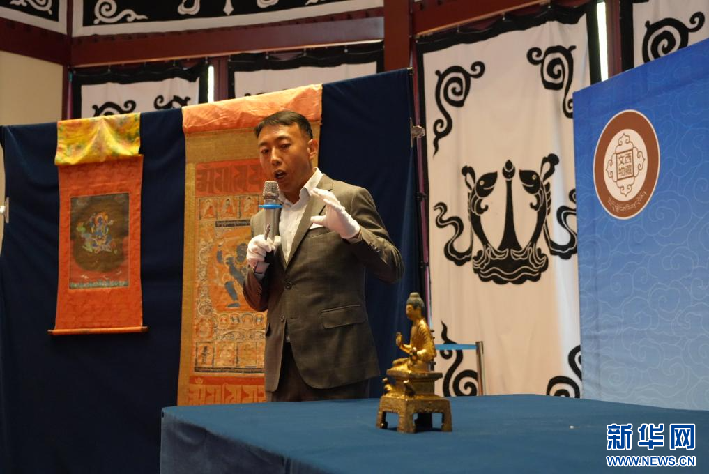色莉瑪向觀眾講解“大慈法王唐卡”。(丹玉 攝)