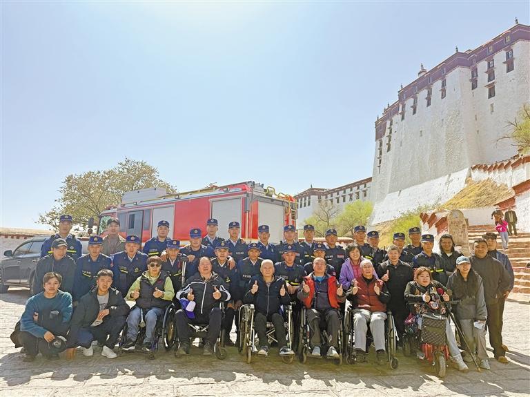 近日,西藏自治區(qū)殘疾人聯(lián)合會攜手西藏自治區(qū)殘疾人就業(yè)創(chuàng)業(yè)園共同舉辦“有愛無礙·推動無障礙”活動,幫助25位殘障人士“圓夢”游覽布達拉宮。這些殘障人士中,有15位肢體殘疾、4位視力殘疾、6位重度輪椅使用者和2位重度全盲者。拉薩市布達拉宮消防救援大隊光榮受命,為本次活動保駕護航。
