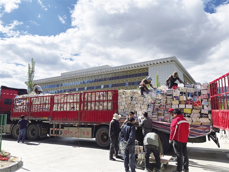 工作人員正在搬運圖書。拉薩市圖書館供圖