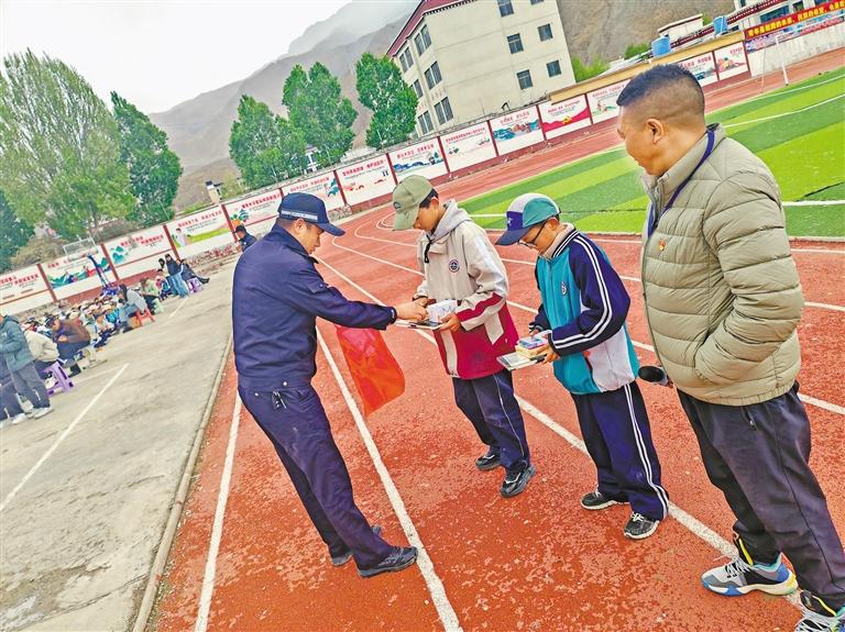 圖為民警為仁布縣中學(xué)兩名拾金不昧少年發(fā)放獎(jiǎng)品。記者 彭琦 攝