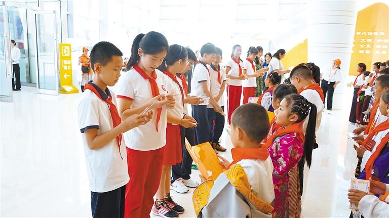 孩子們?cè)谥袊鴭D女兒童博物館與北京市東城區(qū)板廠小學(xué)學(xué)生互贈(zèng)禮物。中國兒童中心供圖