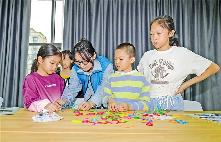 圖為圖書館志愿者與小讀者一起組裝積木。記者 潘多 攝