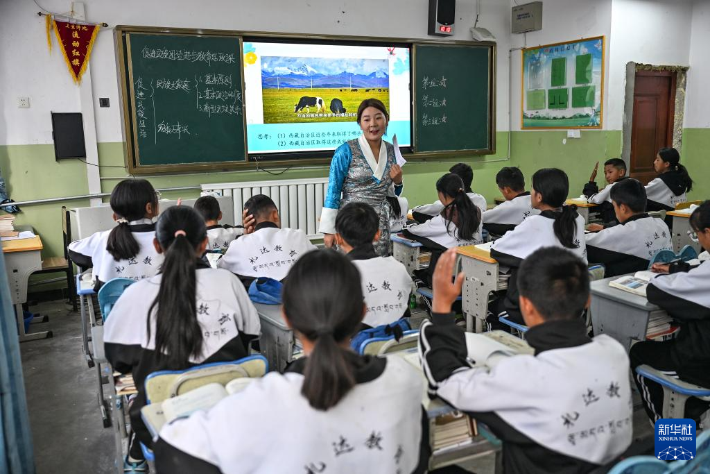 看完一段展示西藏經(jīng)濟社會發(fā)展日新月異的視頻,孩子們眼睛里亮亮的,爭相舉手發(fā)言:“現(xiàn)在交通越來越便捷,村里的游客多了,我們?nèi)ブ苓吺锌h也更方便?!薄案髅褡逋麍F結(jié)一心!西藏的明天會更好!”……