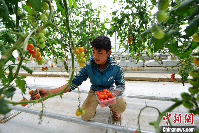 圖為2019年9月,拉薩一高效溫室大棚內(nèi),當?shù)啬贻p的農(nóng)牧民采摘小番茄準備上市銷售。(資料圖) 江飛波 攝