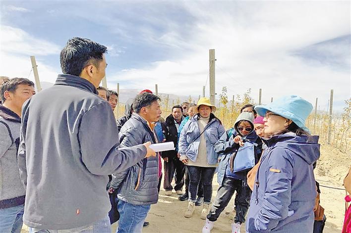 在貢嘎縣森布日高海拔搬遷點(diǎn)扶貧產(chǎn)業(yè)蘋果園觀摩學(xué)習(xí)。記者 王菲 攝