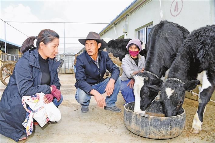 圖為合作社致富帶頭人多布杰(中)在牛場內(nèi)查看奶牛飼養(yǎng)情況。記者 李洲 次旺 攝