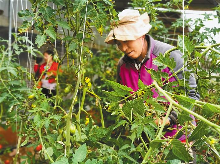 圖為丁青縣農業(yè)生態(tài)產(chǎn)業(yè)園內的工作人員在大棚里為西紅柿綁蔓。記者 周婷婷 攝