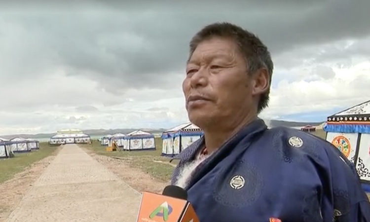 圖為羅次在“移動(dòng)帳篷”前接受采訪 圖片來(lái)源那曲廣播電視臺(tái)