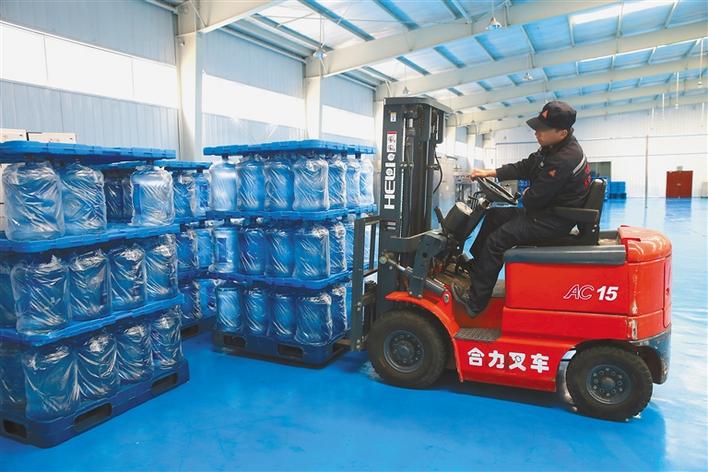 圖為在山南市雅礱天然飲品公司,當?shù)卮迕翊稳蕷W珠正搬運大桶水。 記者次珍攝