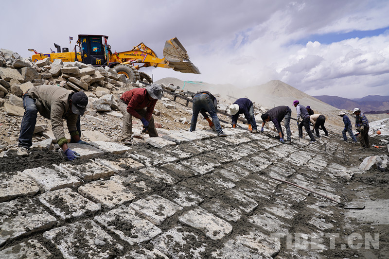 圖為農(nóng)民工施工聯(lián)隊(duì)長洛桑白珍(左二)與農(nóng)民工一起干活