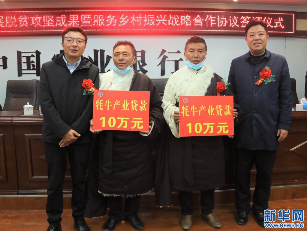 近日,拉薩市當雄縣人民政府與中國農(nóng)業(yè)銀行拉薩分行、西藏財信融資擔保有限公司簽訂鞏固拓展脫貧攻堅成果暨服務(wù)鄉(xiāng)村振興戰(zhàn)略合作協(xié)議,并發(fā)放5筆精準扶貧小額到戶貸款,13筆“惠農(nóng)e貸”,2筆“牦牛產(chǎn)業(yè)貸款”。