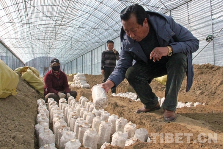 圖為尼瑪指導(dǎo)村民種植靈芝菌包