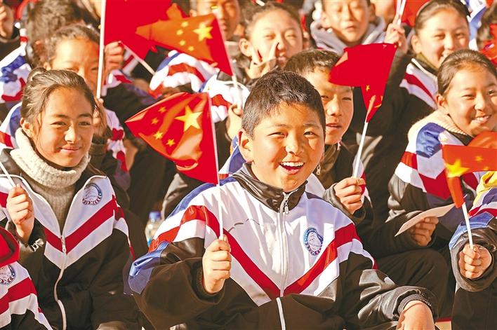 揮舞小國(guó)旗的西藏少年兒童。