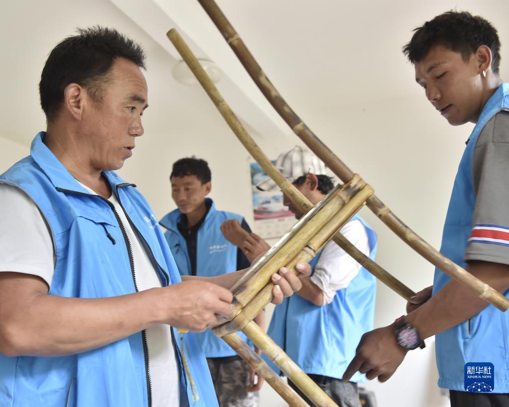 9月15日,西藏定結(jié)縣陳塘鎮(zhèn)農(nóng)民、夏爾巴竹器手工藝傳承人加布(左一)指導(dǎo)村民編制竹器。新華社發(fā)(索朗羅布 攝)