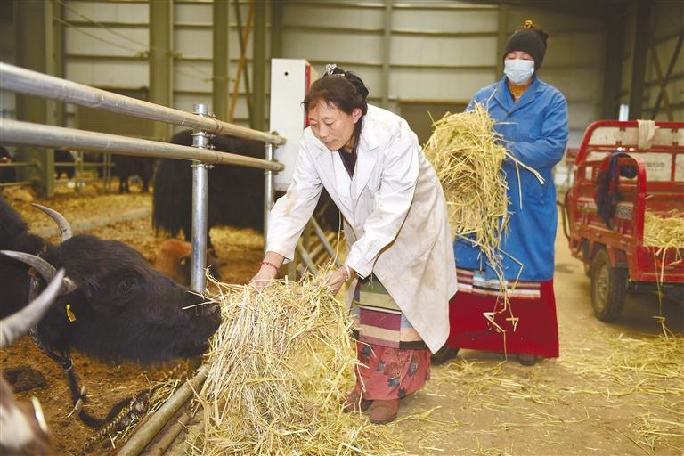 圖為在西藏娘亞牦牛養(yǎng)殖產(chǎn)業(yè)發(fā)展有限責(zé)任公司標(biāo)準(zhǔn)化養(yǎng)殖場(chǎng)內(nèi),員工給娘亞牦牛投喂飼草料。那曲采訪報(bào)道組 攝