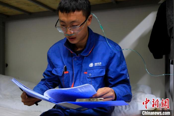 圖為付新程完成當(dāng)日的檢修工作,在宿舍內(nèi)一邊吸氧氣,一邊研究工作方案。 孟瑋 攝