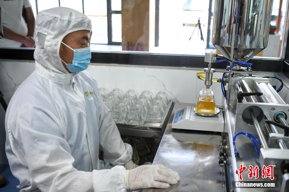 5月28日,在海拔3650米的西藏自治區(qū)山南市貢嘎縣巔峰貢蜜蜂巢一號綜合體的養(yǎng)蜂基地,工作人員正在取蜜。據(jù)悉,該地的巔峰貢蜜項(xiàng)目是湖南長沙市第九批援藏工作隊(duì)牽頭孵化、推進(jìn)并建設(shè)壯大的全新項(xiàng)目。項(xiàng)目于2020年5月開始建設(shè),目前已經(jīng)完成蜂巢一號綜合體、透明工廠、陽光餐廳以及八個(gè)蜜蜂養(yǎng)殖示范基地,帶動藏族同胞就業(yè)358人,投產(chǎn)之后第一年銷售額達(dá)到800萬元。圖為工作人員進(jìn)行取蜜。 楊華峰 攝