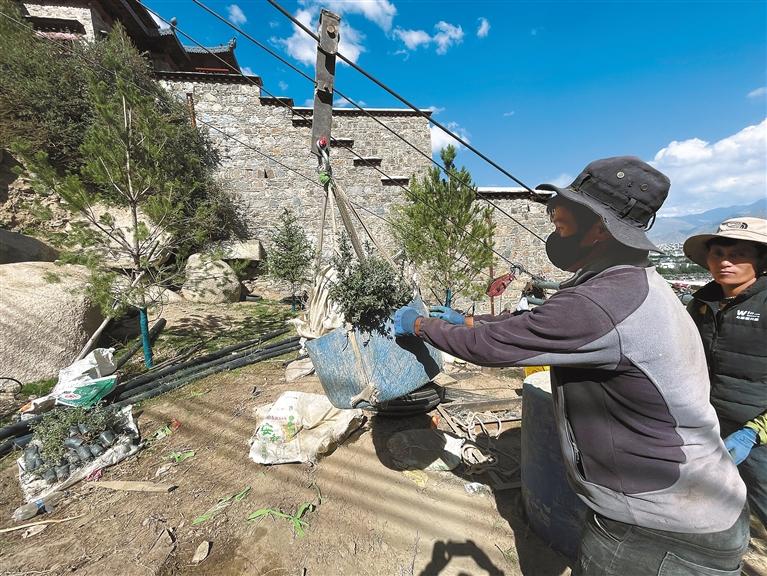 圖為拉薩北山造林的施工人員正在運(yùn)送樹(shù)苗。記者 次旺 攝