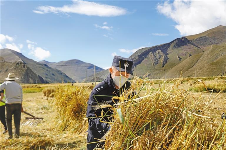 近日,日喀則市康馬縣公安局在統(tǒng)籌安排好工作的同時(shí),組織民輔警志愿者深入南尼鄉(xiāng)楚嘎村田間地頭,幫助缺勞力家庭開(kāi)展秋收。在豐收的田野上,民輔警志愿者分工明確,有的用背負(fù)式收割機(jī)收割,留下一排排青稞茬;有的將成熟的青稞捆扎,堆積成一排排青稞垛子,進(jìn)行晾曬;有的忙于收集青稞穗,不浪費(fèi)一粒糧食。