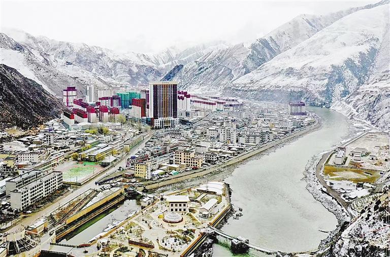 12月的藏北高原已被嚴寒籠罩,頂著風雪,記者來到素有“藏北江南”美譽的比如縣,縣城里縱橫交錯的柏油路、水泥路在白雪的映襯下,顯得格外開闊整潔;街道兩旁高大挺拔的樹披上了綿綿白雪,樹枝上懸掛著亮晶晶的銀條;一棟棟紅白色調(diào)搭配的房屋外墻,經(jīng)過雪水的蕩滌,反射著太陽的光輝,嶄新如初、盡顯生機……