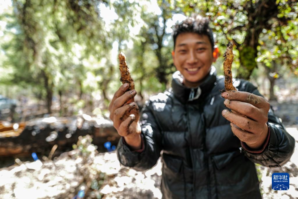 村民正在展示藏天麻種苗(3月24日攝)。新華社記者洛卓嘉措 攝