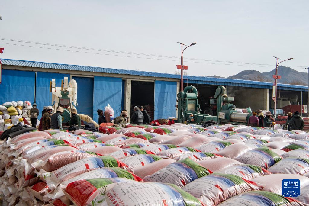 在西藏日喀則市江孜縣紫金鄉(xiāng)努堆村的農(nóng)機農(nóng)民專業(yè)合作社內(nèi),兩臺青稞種谷物精選機正開足馬力,給新收獲的青稞良種過篩、除雜、包衣、裝袋,50公斤一袋的青稞良種已碼滿大半個院子。