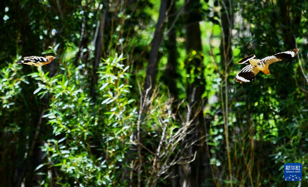 在白定村樹(shù)林里飛舞的戴勝(6月29日攝)。新華社記者 張汝鋒 攝