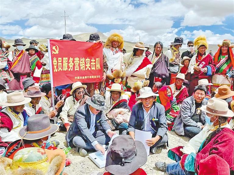 農(nóng)行改則縣支行黨員服務(wù)營(yíng)銷突擊隊(duì)深入群眾宣講金融政策。
