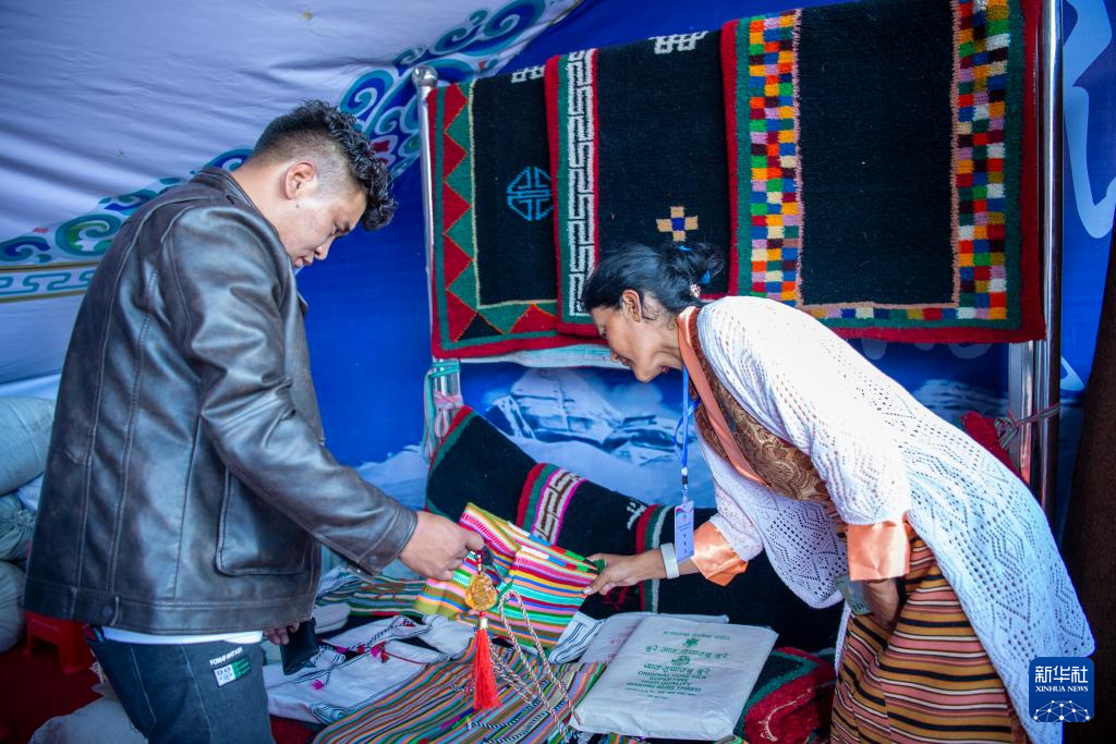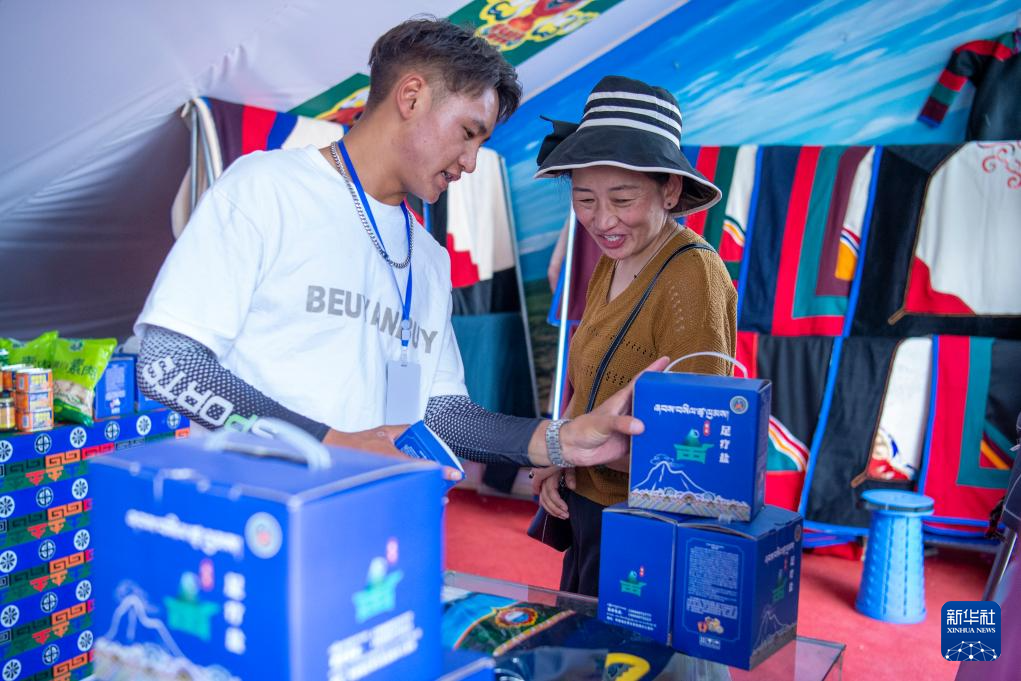 革吉縣鹽湖鄉(xiāng)羌麥村的村民旦真旺杰(左)在展銷會(huì)現(xiàn)場(chǎng)為顧客介紹產(chǎn)品(8月22日攝)。新華社發(fā)(旦增努布攝)