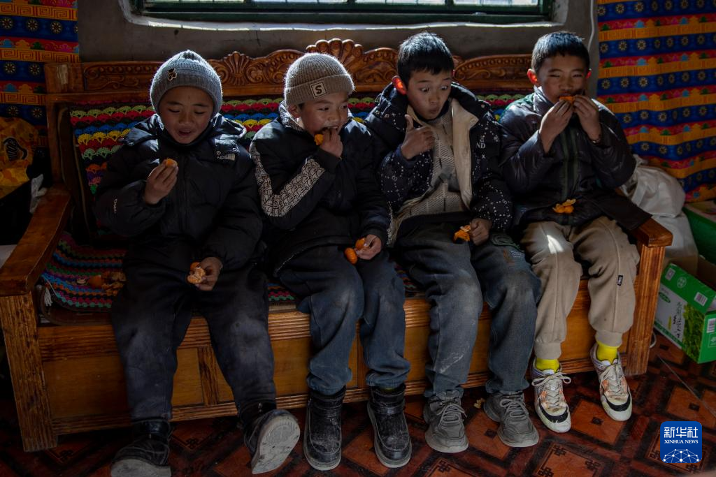 申扎縣馬躍鄉(xiāng)貝嘎四村的幾名小朋友在村里的“偏遠(yuǎn)鄉(xiāng)鎮(zhèn)果蔬配送試點(diǎn)項(xiàng)目”直銷點(diǎn),買來(lái)當(dāng)天供銷合作社配送來(lái)的新鮮水果品嘗(1月5日攝)。新華社記者姜帆 攝