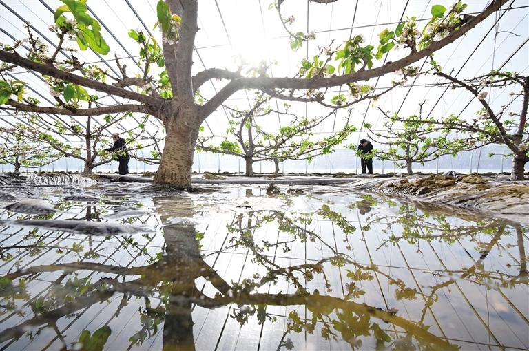 河北省灤州市茨榆坨鎮(zhèn)的果農(nóng)在大棚內給櫻桃樹疏花。