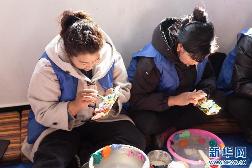 圖為西藏現(xiàn)代服務(wù)業(yè)技工學校的學員正在制作卡塞“德格”(1月29日攝)。新華網(wǎng)發(fā) 李騰 攝