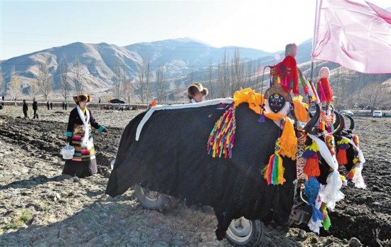 喝完青稞粥,多吉曲珍全家一起出動(dòng)去社區(qū)高標(biāo)準(zhǔn)農(nóng)田參加春耕儀式。
