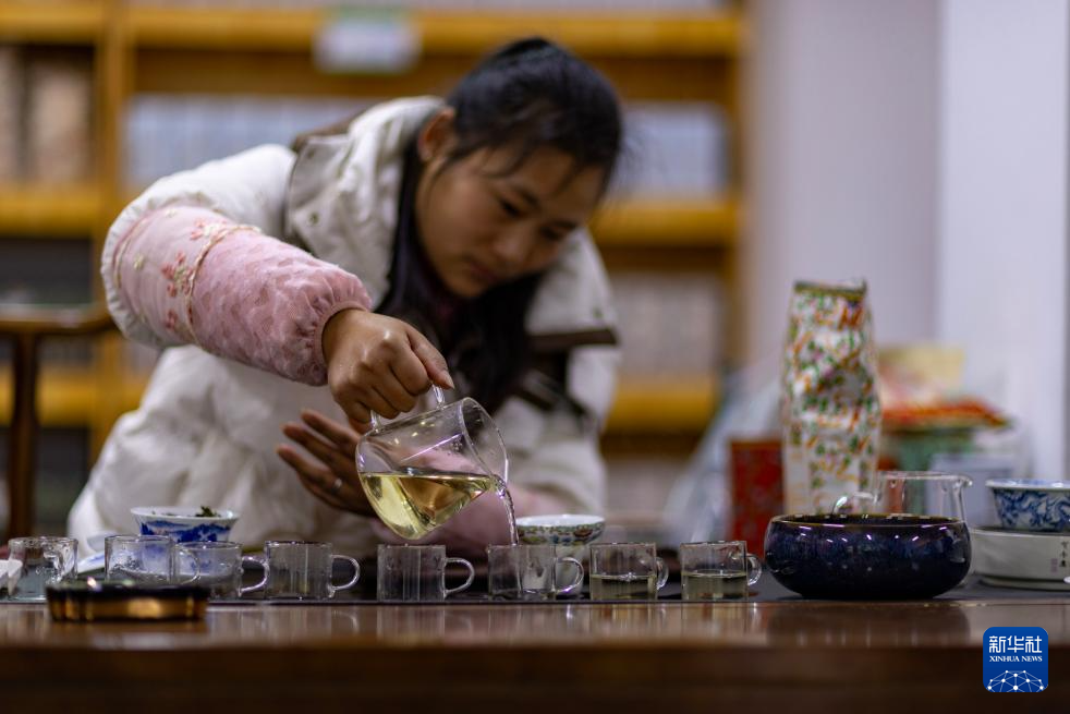 墨脫縣背崩鄉(xiāng)格林村村民袁美華在村里的特產(chǎn)銷售部給游客泡茶(4月24日攝)。新華社記者 姜帆 攝