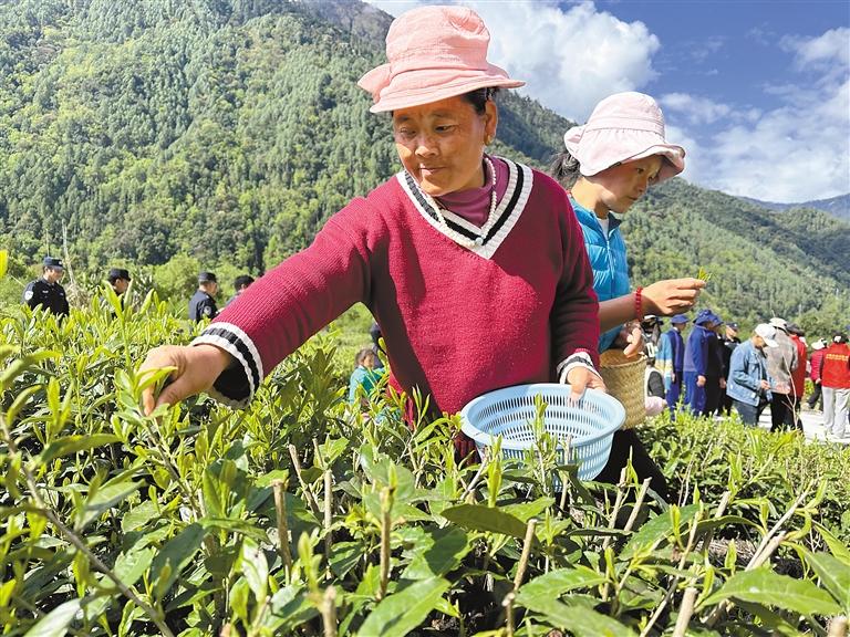 在墨脫縣格當鄉(xiāng)德吉村,茶農(nóng)在采摘春茶。王凱 記者 王敏 攝