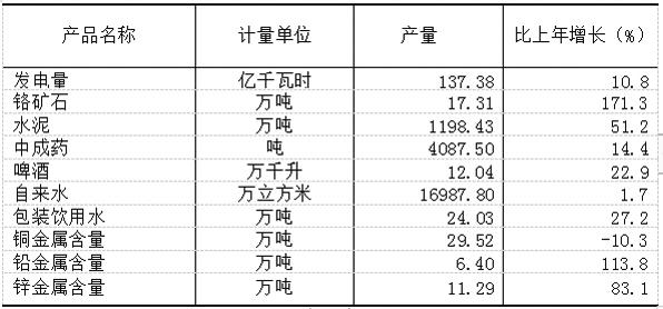 全年規(guī)模以上工業(yè)企業(yè)水泥產(chǎn)量1198.43萬噸,比上年增長51.2%;鉻礦石17.31萬噸,增長171.3%;中成藥(藏醫(yī)藥)4087.50噸,增長14.4%;自來水16987.80萬立方米,增長1.7%;發(fā)電量137.38億千瓦時(shí),增長10.8%;啤酒12.04萬千升,增長22.9%;包裝飲用水24.03萬噸,增長27.2%。