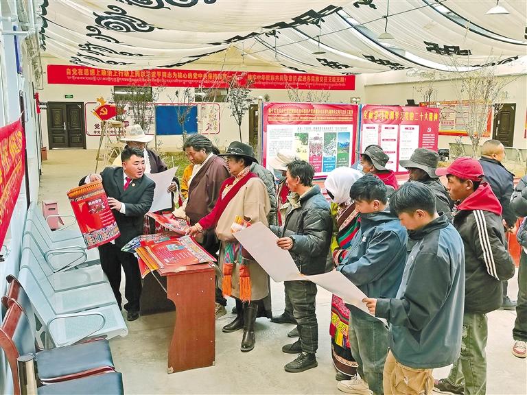 那曲市雙湖縣措折羅瑪鎮(zhèn)第三屆“鄉(xiāng)村振興 那曲奮進”活動中,法庭干警(左一)向群眾進行普法宣傳。