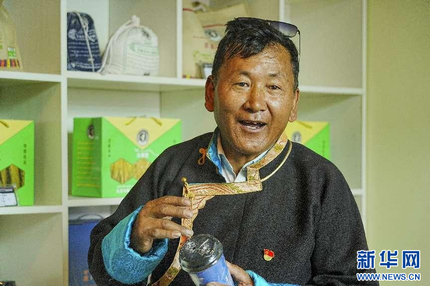 圖為申藏村黨支部書記旺扎在介紹新產品(9月2日攝)。新華網(wǎng)發(fā) 喬柯嵐攝