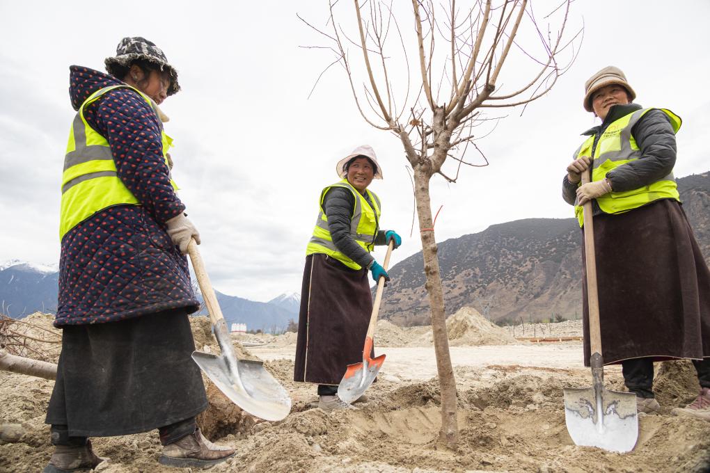 3月30日,西藏林芝市巴宜區(qū)林芝鎮(zhèn)嘎拉村村民尼瑪曲吉(中)與姐妹們一起在尼洋河灘上種樹(shù)。新華社記者丁增尼達(dá) 攝