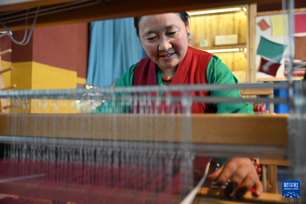 在西藏日喀則市江孜縣班覺倫布村的阿佳格桑工坊,手工藝人阿佳格桑使用新式織機編織氆氌(9月3日攝)。新華社記者 孫瑞博 攝