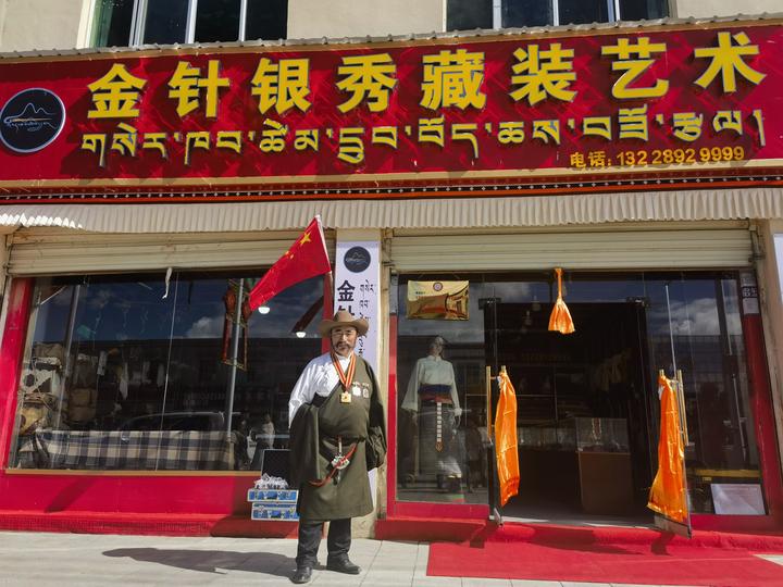 布嘎在他的“金針銀秀藏裝藝術(shù)”縫紉店前。新華社記者 舒靜 攝