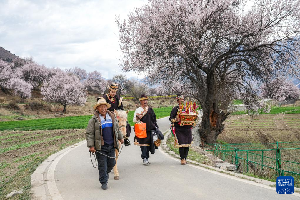 4月3日,林芝市朵當(dāng)村群眾身著盛裝、手捧切瑪為游客提供民俗體驗(yàn)活動。新華社記者 丁增尼達(dá) 攝