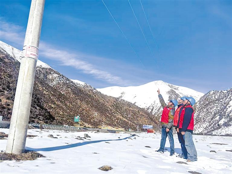 圖為國(guó)網(wǎng)工布江達(dá)縣供電公司工作人員在檢查線路。記者 劉楓 謝筱純 通訊員 多吉旺堆 張民澤 攝