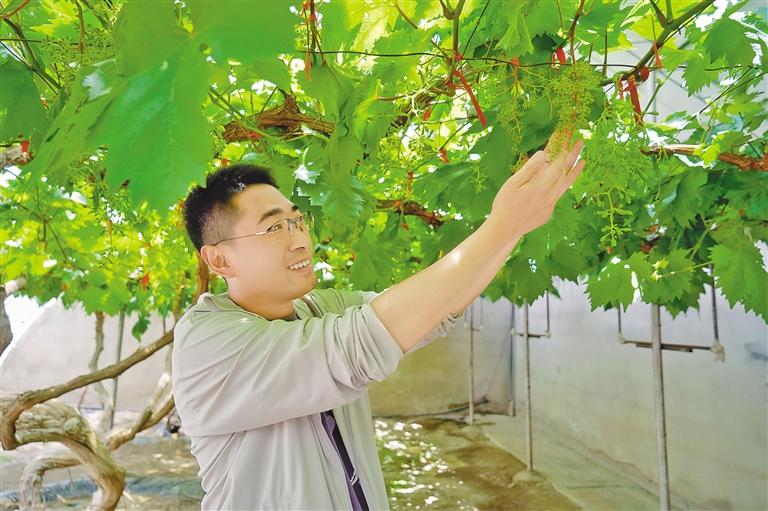 西藏農(nóng)牧科學(xué)院現(xiàn)代化葡萄種植示范基地內(nèi),工作人員正在查看葡萄長(zhǎng)勢(shì)。