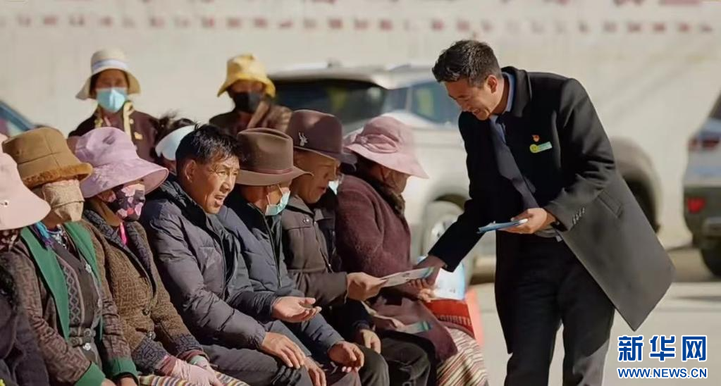 工作人員阿旺旦增為扎洞村群眾宣講金融知識,并介紹“庭院經(jīng)濟(jì)貸”相關(guān)業(yè)務(wù)。(中國農(nóng)業(yè)銀行股份有限公司山南分行供圖)