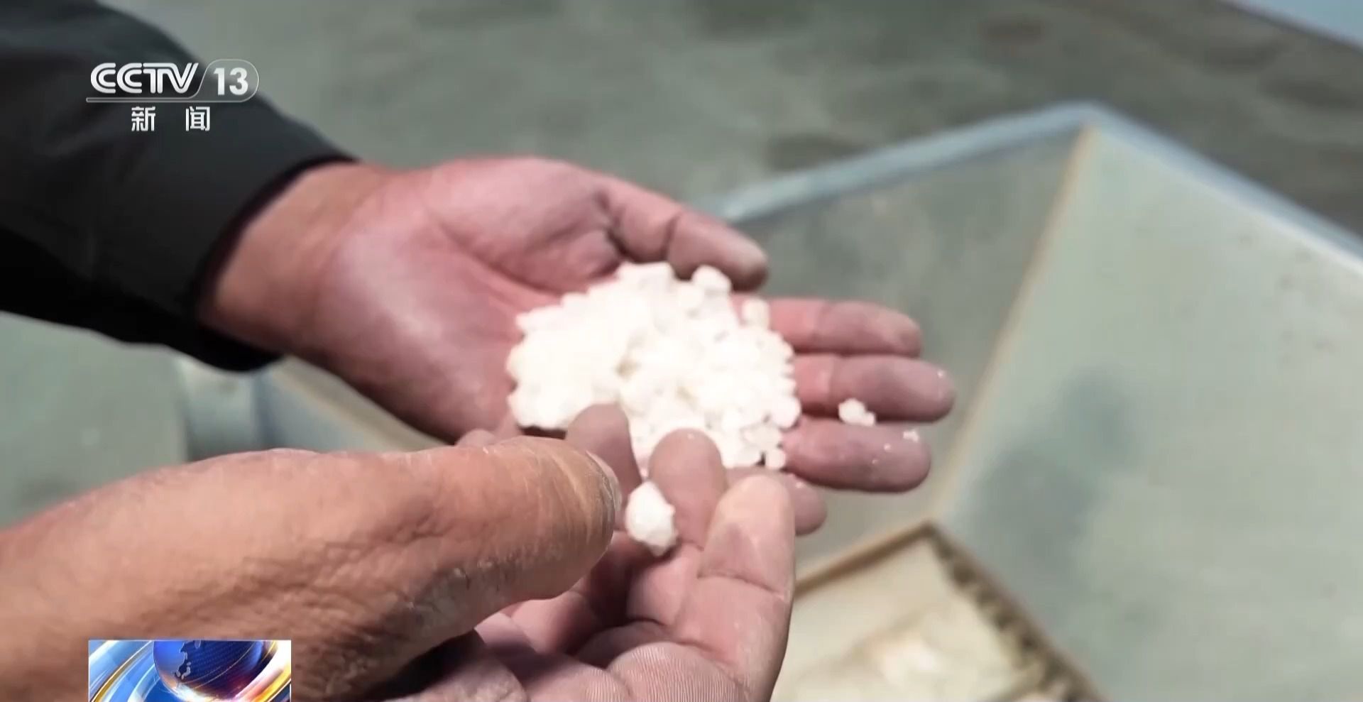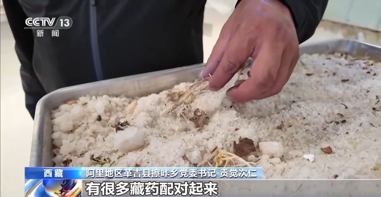 阿里地區(qū)革吉縣擦咔鄉(xiāng)黨委書記 貢覺次仁:這個就是足療鹽的原料,除了鹽以外還有很多藏藥,將原料先做初步的粉碎,然后進(jìn)行混合,最后磨成跟面粉一樣。