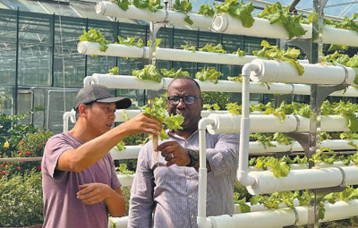 中國援多米尼克農業(yè)技術合作項目始于2005年,目前已開展至第八期。項目引進了多個高附加值農作物品種,促進了多米尼克農業(yè)產業(yè)升級。圖為中多兩國農業(yè)專家在觀察水培系統(tǒng)種苗生長情況。