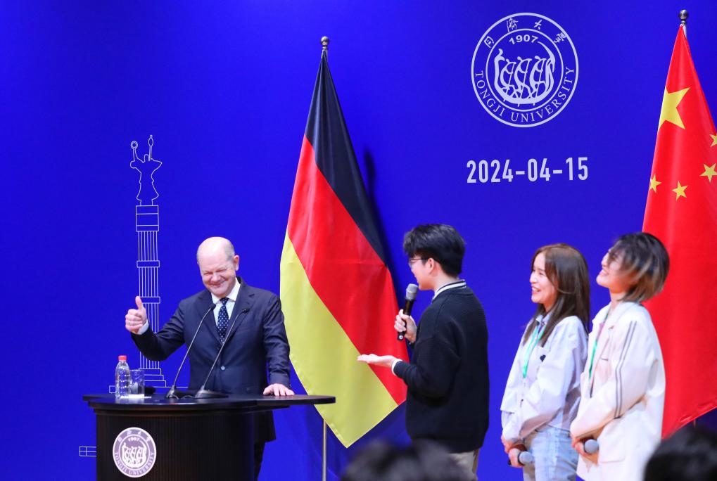 4月15日,德國總理朔爾茨(左)在同濟(jì)大學(xué)嘉定校區(qū)與學(xué)生進(jìn)行交流。新華社記者方喆 攝
