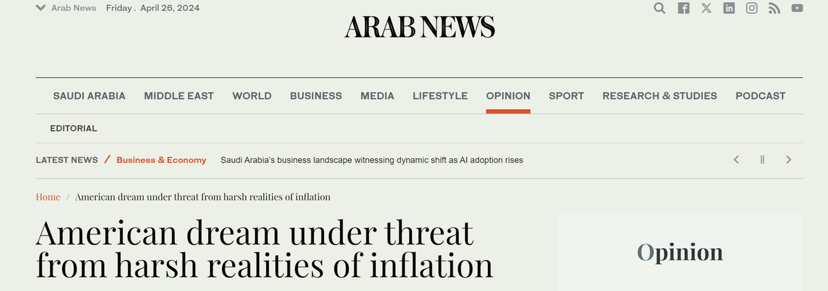 沙特阿拉伯媒體《阿拉伯新聞》網(wǎng)站4月24日刊發(fā)評(píng)論文章稱,美國(guó)通脹高企,物價(jià)不斷上漲,導(dǎo)致民眾的購(gòu)買力持續(xù)下降,基本生活消費(fèi)品成為無(wú)力負(fù)擔(dān)的“奢侈品”?!懊绹?guó)夢(mèng)”被殘酷的現(xiàn)實(shí)擊潰。文章批評(píng)美國(guó)政府對(duì)通脹危機(jī)的反應(yīng)嚴(yán)重不足,將黨派問(wèn)題置于解決民眾的迫切需求之上,削弱了民眾的信任感。